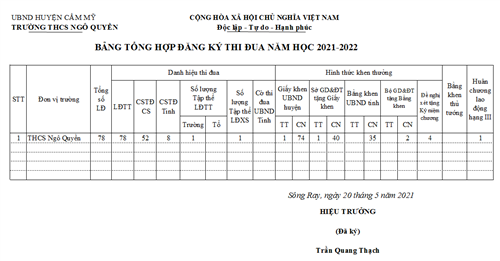 Bảng tổng hợp đăng ký thi đua năm học 2021-2022
